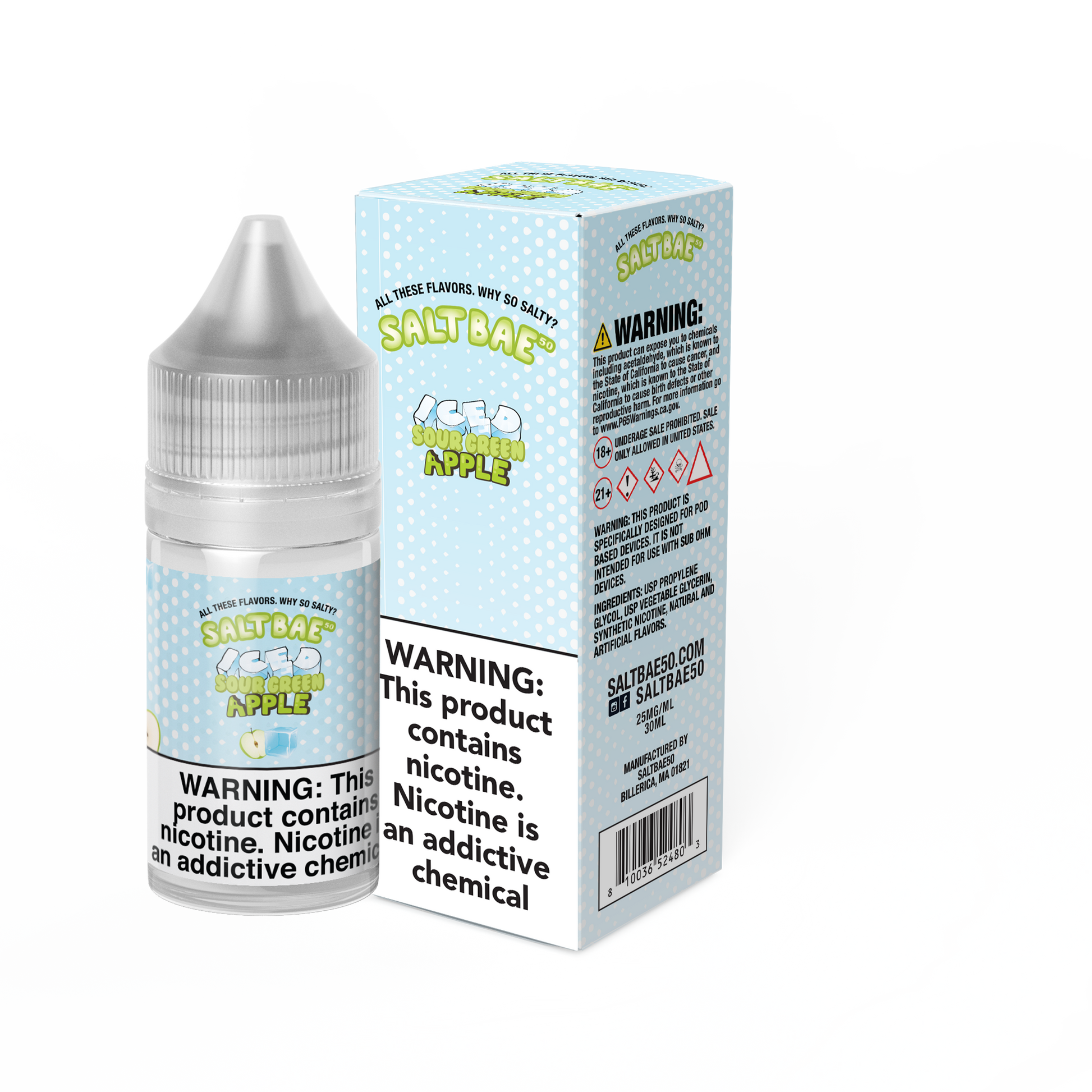 SaltBae50 takes the lead by offering Sour Green Apple Iced vape juice that is pure, crisp, and juicy with a cool burst of minty menthol in the ices version that will keep you coming back for more.